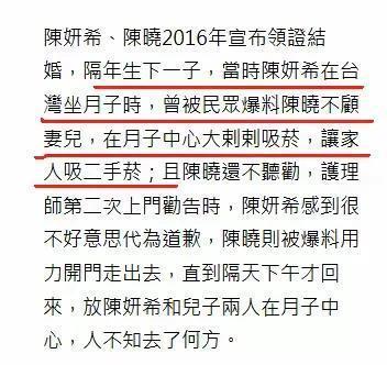 此后便有多个知名娱乐博主开始曝出陈晓与陈妍希的婚变传闻,还传陈晓曾在月子中心与陈妍希吵架。